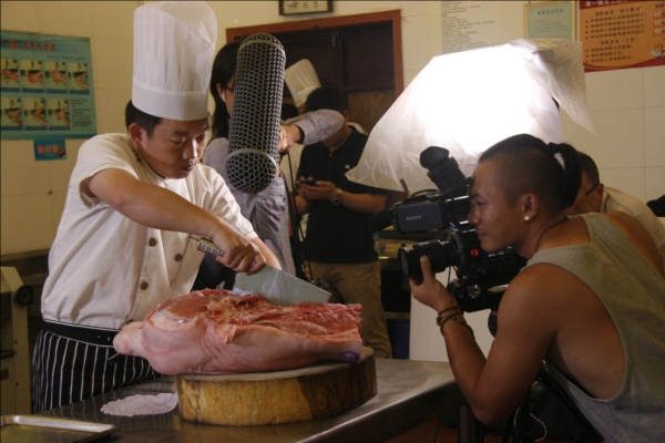 《舌尖上的中国2》剧组在第一楼拍摄高级烹调技师王海波制作传统豫菜“鲤鱼焙面”拍摄现场