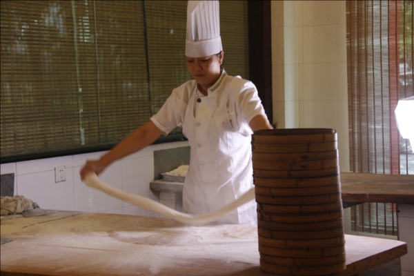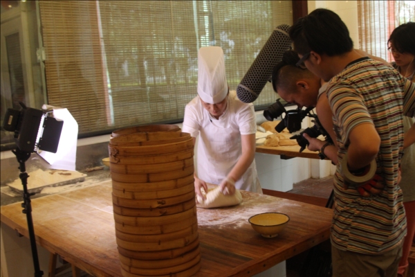 《舌尖上的中国2》剧组在第一楼拍摄高级包子师马瑞制作“小笼灌汤包子”拍摄现场。
